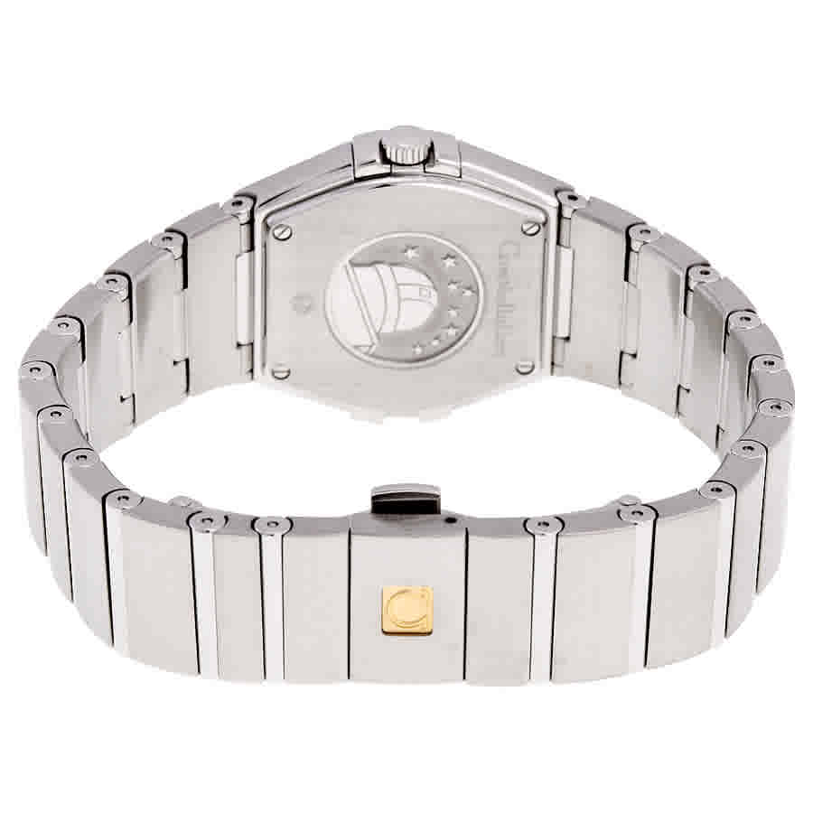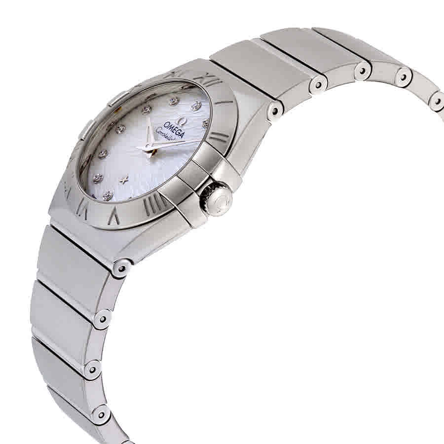 Stainless steel case with a stainless steel bracelet. Fixed stainless steel bezel. Mother of pearl dial with silver-tone hands and diamond hour markers. Dial Type: Analog. Luminescent hands. Quartz movement. Scratch resistant sapphire crystal. Pull / push crown. Solid case back. Case diameter: 27 mm. Case thickness: 9 mm. Round case shape. Band width: 19 mm. Band length: 7.5 inches. Fold over clasp with a push button release. Water resistant at 100 meters / 330 feet. Functions: hour, minute, second. Luxury watch style. Omega Constellation MOP Dial Stainless Steel Ladies Watch 12310276055004.