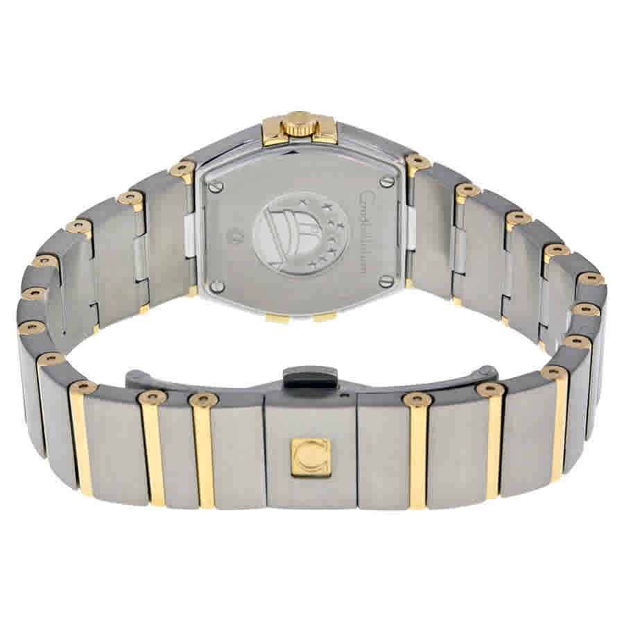 Stainless steel case with a stainless steel bracelet with 18kt gold bars. Fixed 18kt gold bezel set with diamonds. White mother of pearl dial with gold hands and diamond hour markers. Dial Type: Analog. Quartz movement. Scratch resistant sapphire crystal. Pull / push crown. Solid case back. Case diameter: 24 mm. Round case shape. Band width: 10.05 mm. Band length: 7.5 inches. Fold over clasp with a push button release. Water resistant at 100 meters / 330 feet. Functions: hour, minute. Luxury watch style. Watch label: Swiss Made. Omega Constellation White Mother-of-Pearl Diamond Dial Stainless Steel Ladies Watch 123.25.24.60.55.003.