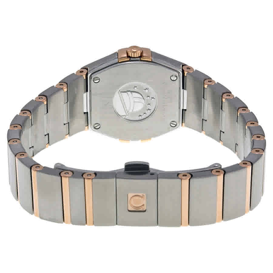 Stainless steel case with a stainless steel bracelet with 18kt rose gold bars. Fixed 18kt rose gold bezel. Mother of pearl dial with gold-tone hands and index hour markers. Quartz movement. Scratch resistant sapphire crystal. Solid case back. Case diameter: 24 mm. Case thicknes: 8 mm. Bracelet width: 11 mm. Push button fold over clasp. Water resistant at 30 meters/ 100 feet. Functions: hours, minutes. Omega Constellation Two Tone Rose Gold Ladies Watch 12320246005001.