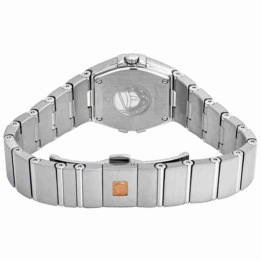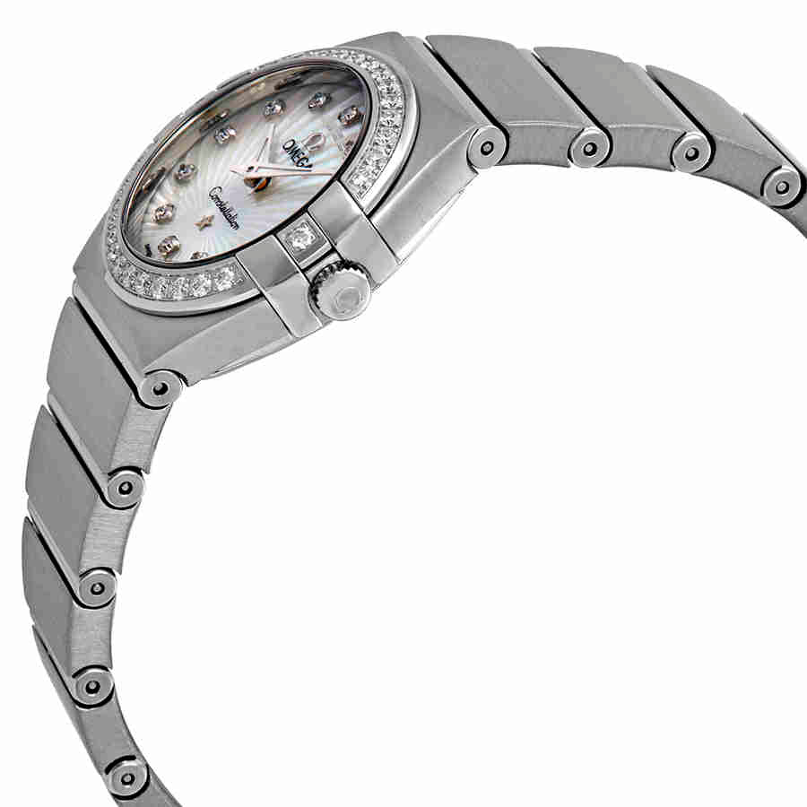 Silver-tone stainless steel case with a silver-tone stainless steel bracelet. Fixed, diamond set stainless steel bezel. Mother of pearl dial with silver-tone hands and diamonds hour markers. Dial Type: Analog. Omega...