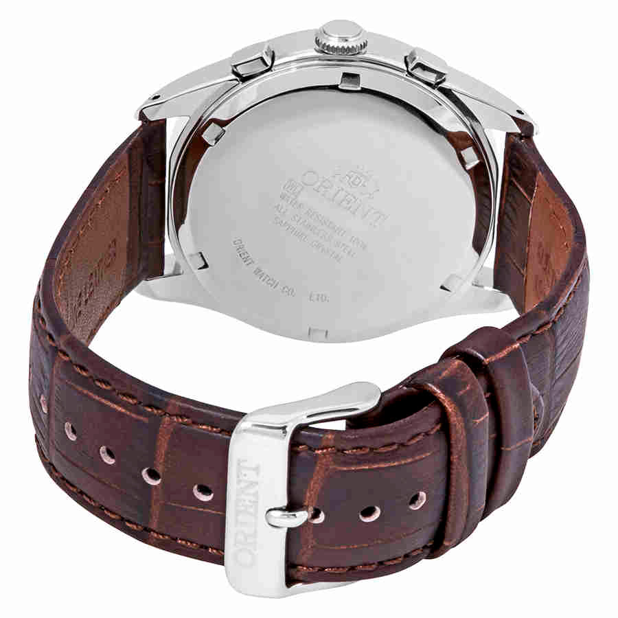 Stainless steel case with a brown leather strap. Fixed stainless steel bezel. White dial with luminous black hands and index hour markers. Minute markers. Tachymeter markings around the outer rim. Dial Type: Analog. Luminescent hands. Date display at the 12 o'clock position. Chronograph - three sub-dials displaying: 60 second, 60 minute and 24 hour. Orient calibre KFC00 quartz movement. Scratch resistant sapphire crystal. Pull / push crown. Solid case back. Round case shape. Case size: 41.5 mm. Case thickness: 11.5 mm. Band width: 22 mm. Tang clasp. Water resistant at 100 meters / 330 feet. Functions: chronograph, tachymeter, big date, hour, minute, small second. Sport watch style. Watch label: Japan Movt. Orient Classic Chronograph White Dial Mens Watch FTV01005W.