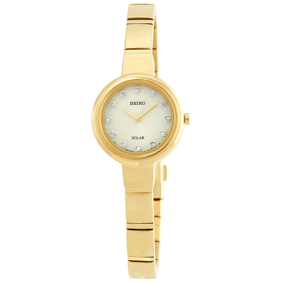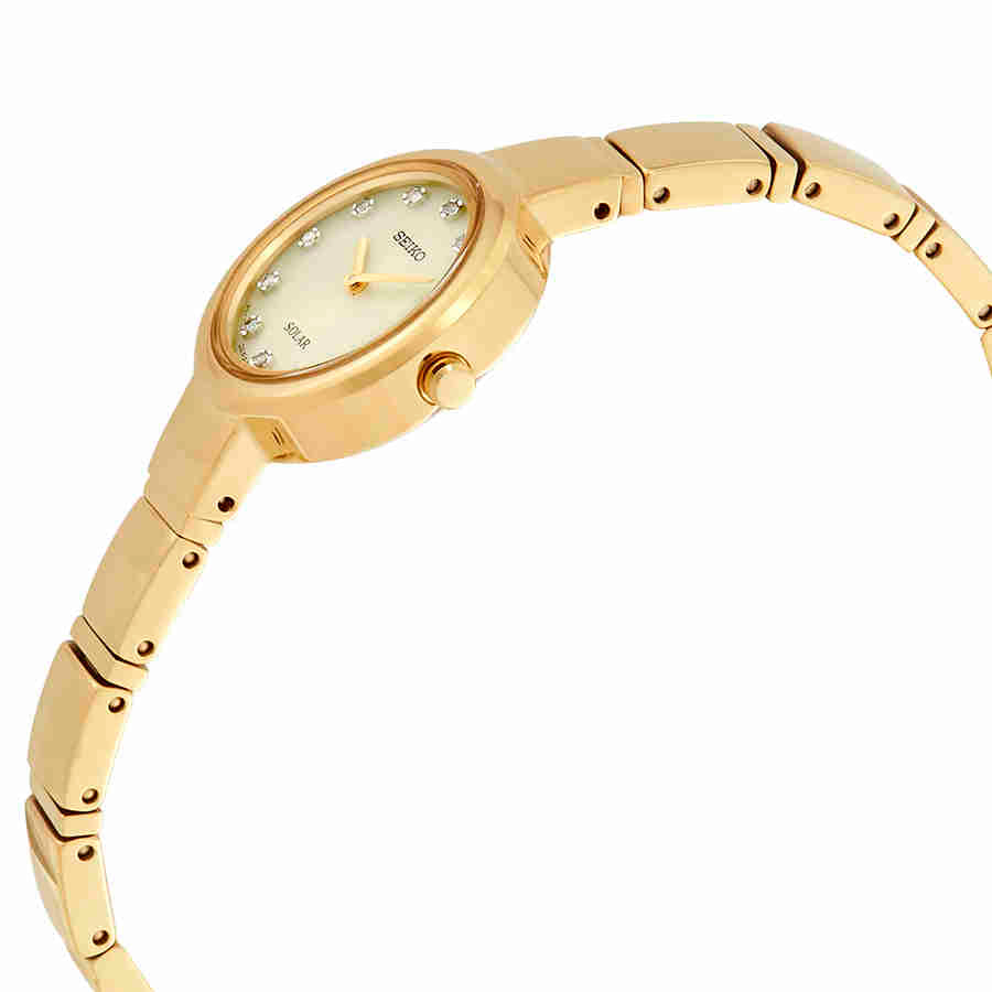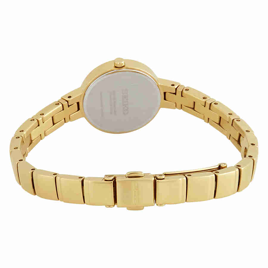 Gold-tone stainless steel case with a gold-tone stainless steel bracelet. Fixed gold-tone bezel. Gold-tone dial with gold-tone hands and diamond hour markers. Dial Type: Analog. Seiko caliber V115 quartz movement. Scratch...