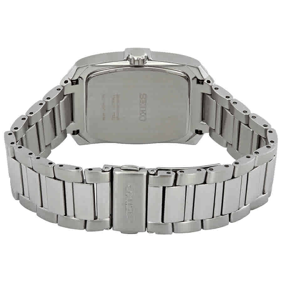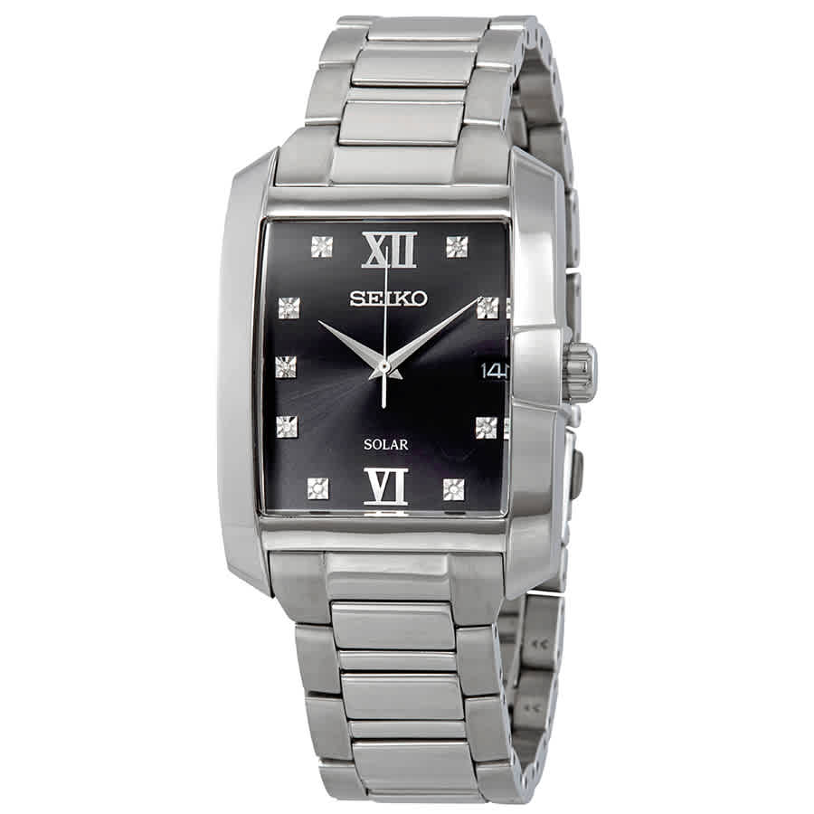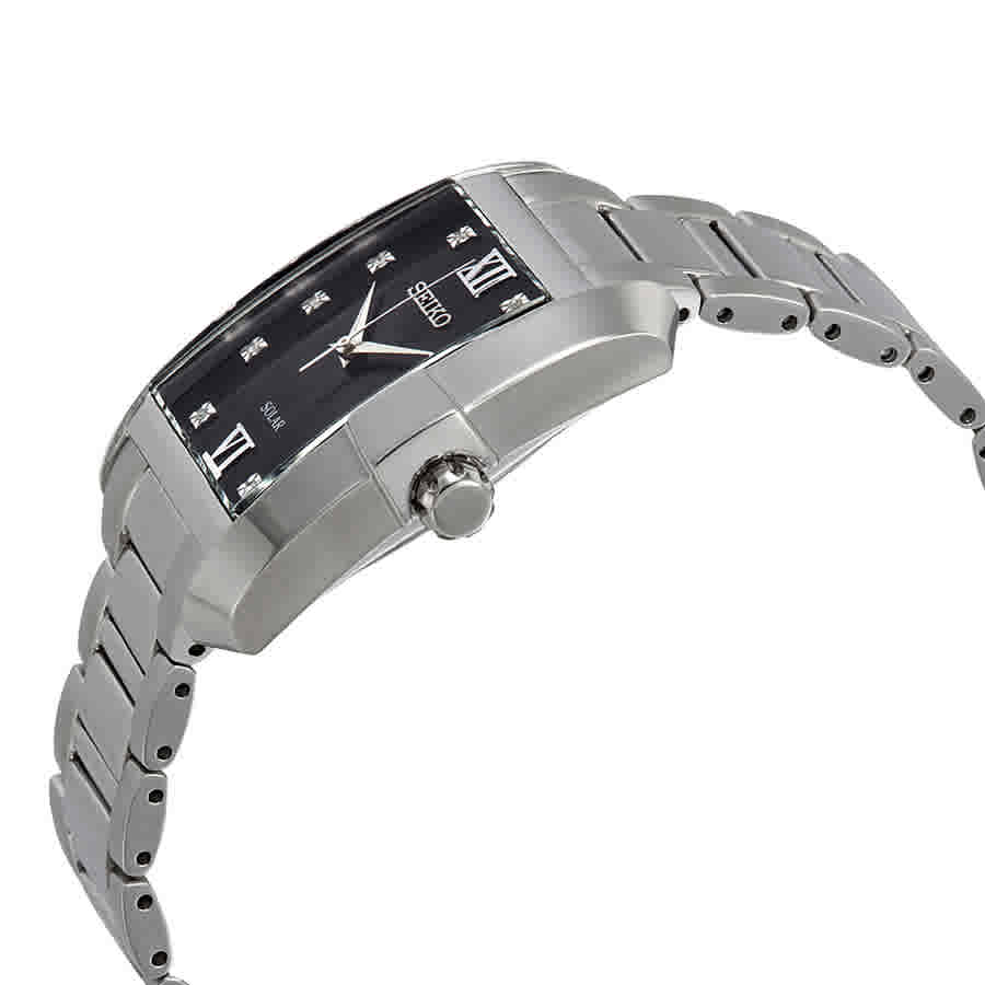 Silver-tone stainless steel case with a silver-tone stainless steel bracelet. Fixed silver-tone stainless steel bezel. Black dial with silver-tone hands and diamond hour markers. Roman numerals mark the 6 and 12 o' clock positions. Dial Type: Analog. Date display at the 3 o'clock position. Seiko Caliber V157 eco-drive movement. Scratch resistant hardlex crystal. Pull / push crown. Solid case back. Rectangle case shape, case size: 34.5 mm, case thickness: 10.7 mm. Band width: 23 mm. Fold over with push button release clasp. Water resistant at 30 meters / 100 feet. Functions: date, hour, minute, second, solar-powered. Additional Info: powered by light energy - no battery change required. Dress watch style. Watch label: Japan Movt. Seiko Diamonds Solar Powerd Black Dial Ladies Watch SNE461.