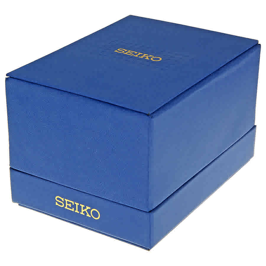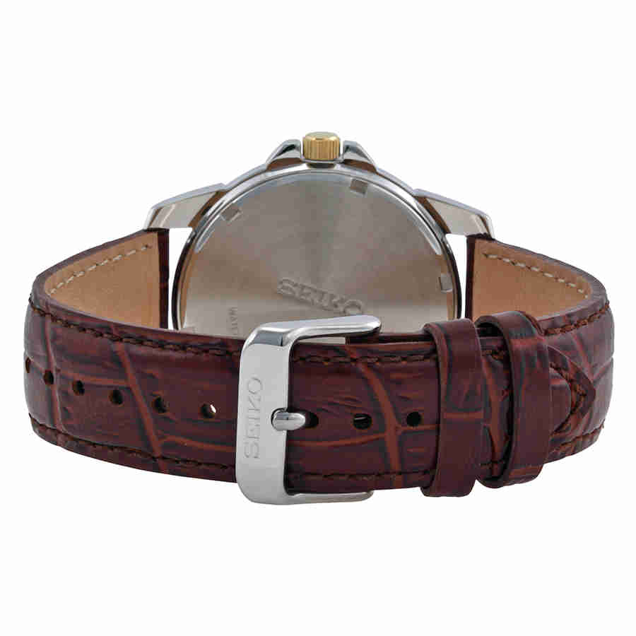 Silver-tone stainless steel case with a brown leather strap. Fixed gold-tone stainless steel bezel. Blue dial with luminous gold-tone hands and index hour markers. Minute markers around the outer rim. Dial Type: Analog. Luminescent hands. Day of the week and date display at the 3 o'clock position. Seiko Caliber V158 quartz movement. Scratch resistant hardlex crystal. Solid case back. Round case shape, case size: 37 mm, case thickness: 10 mm. Band width: 20 mm. Tang clasp. Water resistant at 100 meters / 330 feet. Functions: date, day, hour, minute, second, solar-powered. Additional Info: gold-tone. Casual watch style. Watch label: Japan Movt. Seiko Functional Solar Blue Dial Mens Watch SNE102.