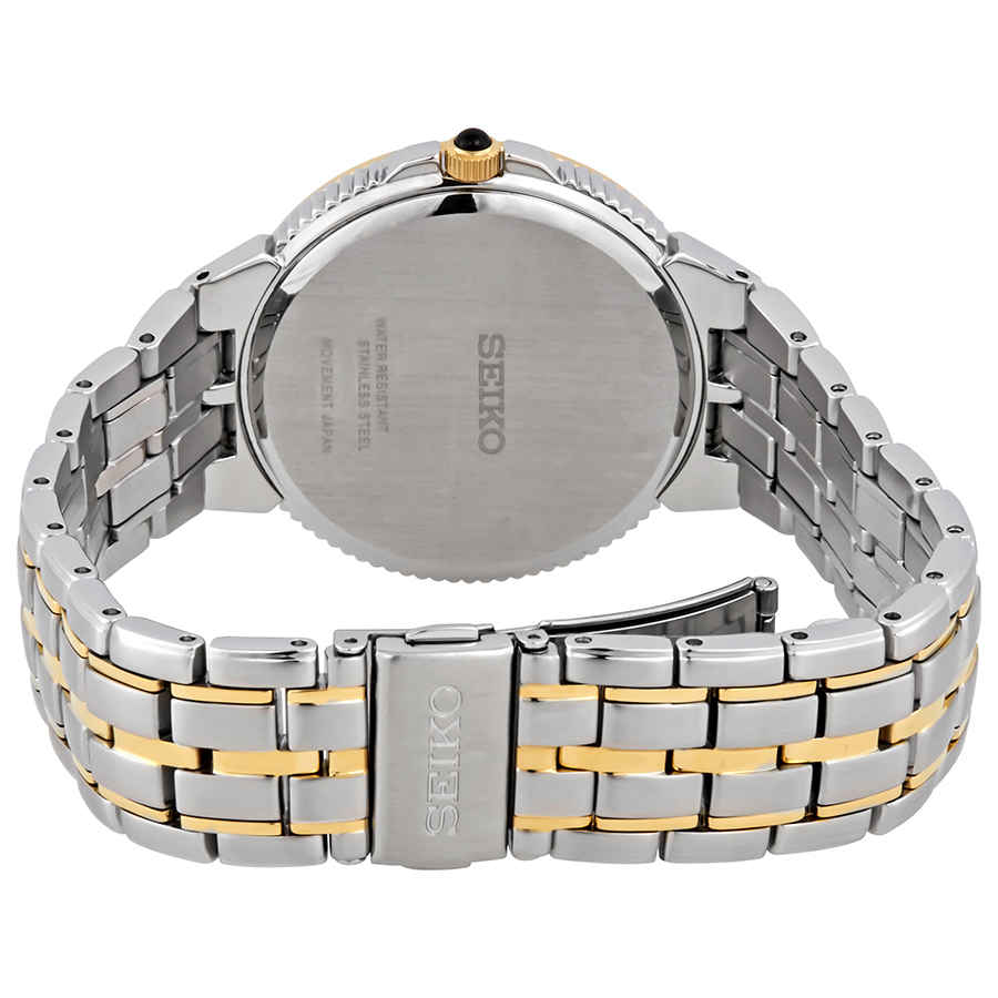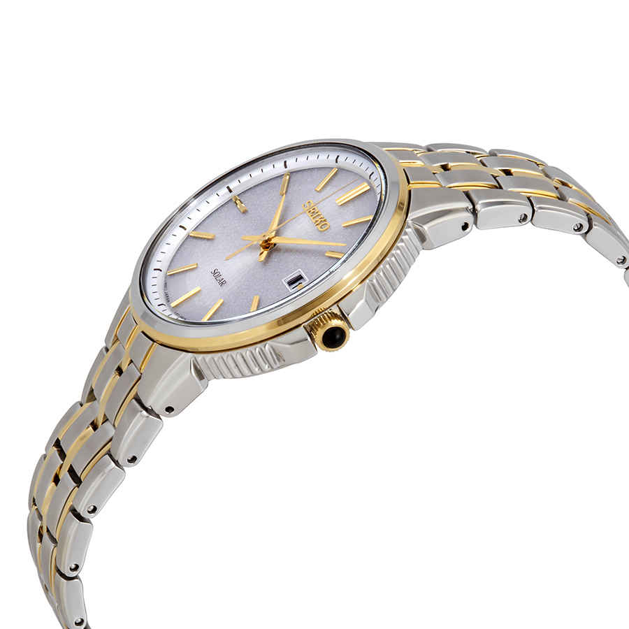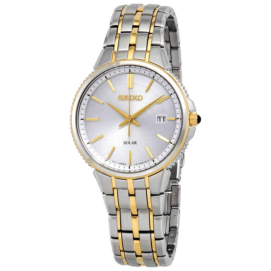 Two-tone (silver-tone and gold-tone) stainless steel case with a two-tone (silver-tone and gold-tone) stainless steel bracelet. Fixed gold-tone stainless steel bezel. Silver dial with gold-tone hands and index hour markers. Minute markers around the outer rim. Dial Type: Analog. Date display at the 3 o'clock position. Seiko Caliber V157 eco-drive movement with a 10-month power reserve. Cabochon crown. Solid case back. Round case shape. Case size: 40 mm. Water resistant at 50 meters / 165 feet. Functions: date, hour, minute, second. Additional Info: cabochon crown. Casual watch style. Watch label: Japan Movt. Seiko Solar Silver Dial Mens Watch SNE508.
