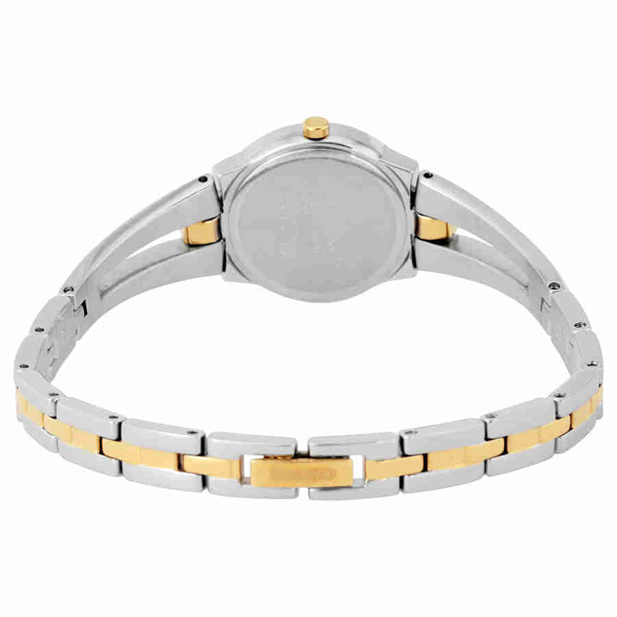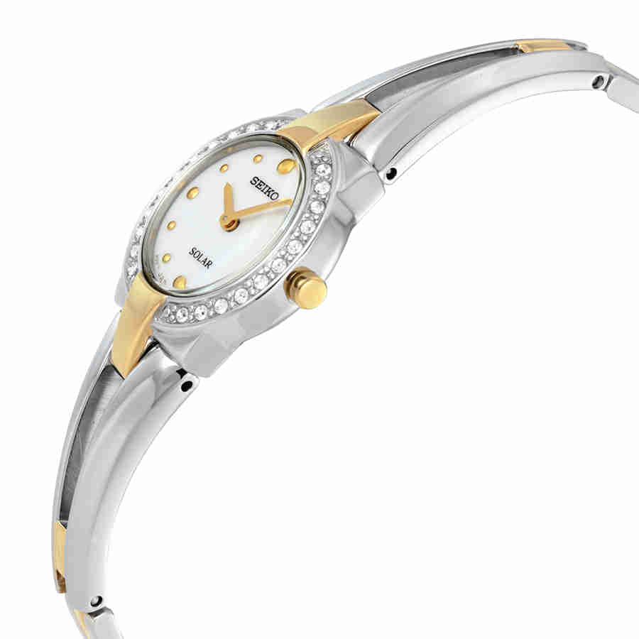 Stainless steel case with a two-tone (silver and gold-plated) stainless steel bracelet. Fixed silver-tone bezel set with Swarovski crystals. White dial with gold-tone hands and dot hour markers. Dial Type: Analog. Solar powered quartz movement with a 12 month power reserve. Scratch resistant mineral crystal. Pull / push crown. Solid case back. Case size: 21 mm. Case thickness: 7 mm. Round case shape. Band width: 12 mm. Jewelry clasp. Water resistant at 30 meters / 100 feet. Functions: hour, minute. Casual watch style. Watch label: Japan Movt. Seiko Solar White Dial Two-tone Ladies Watch SUP206.