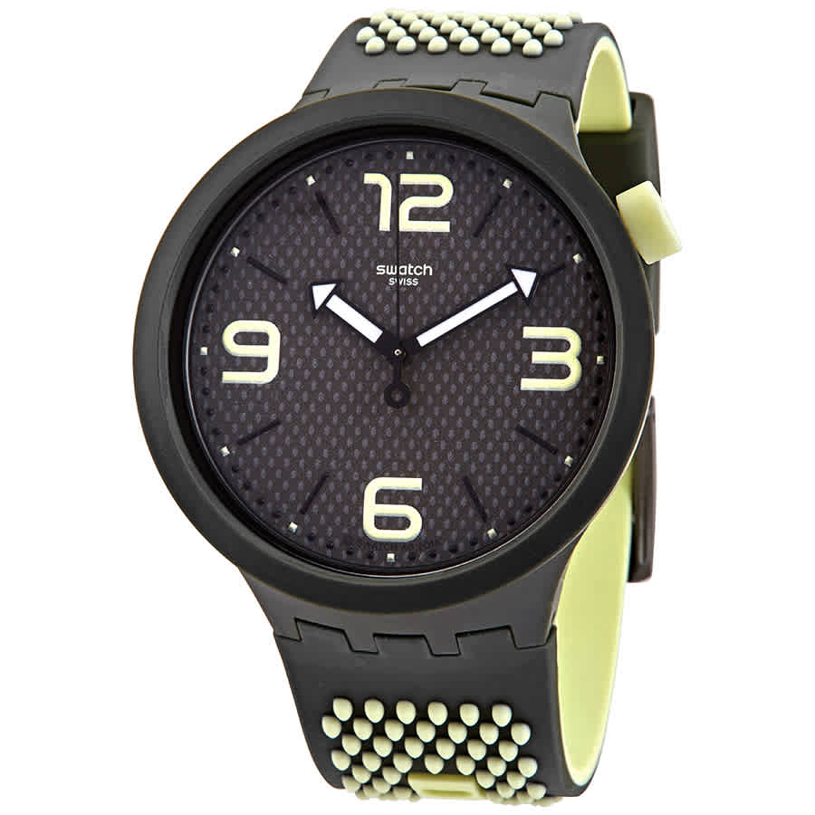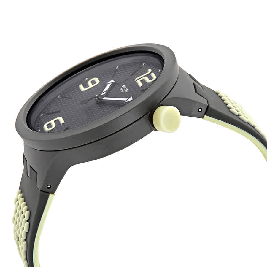Grey plastic case with a grey-yellow silicone strap. Fixed bezel. Grey dial with black hands and index-Arabic numerals hour markers. Dial Type: Analog. Quartz movement. Pull / push crown. Solid case back. Round case shape, case size: 47 mm, case thickness: 11.75 mm. Buckle clasp. Water resistant at 30 meters / 100 feet. Functions: hour, minute, second. Casual watch style. Swatch BBBlood Quartz Grey Dial Mens Watch SO27M102.