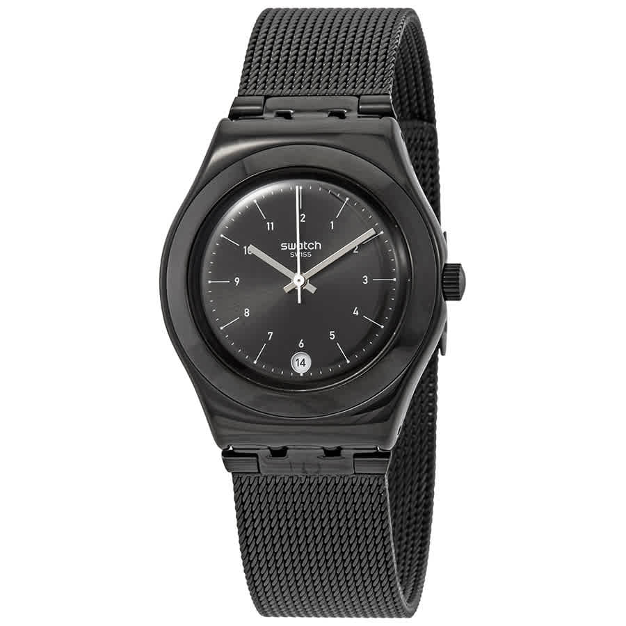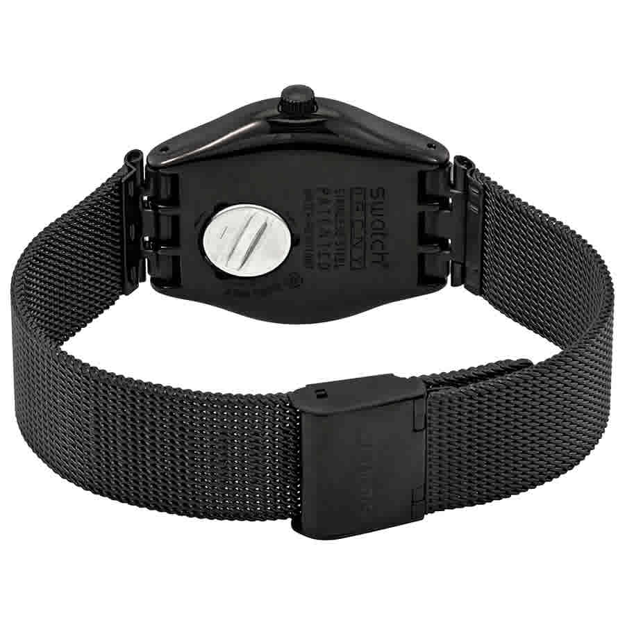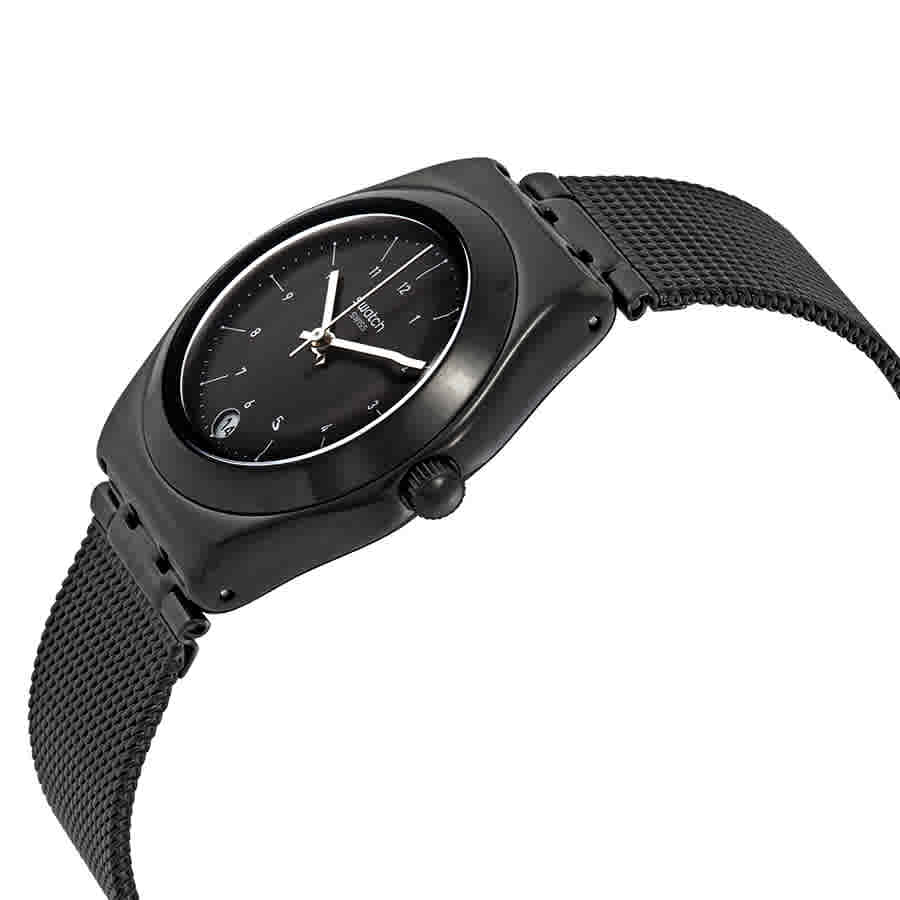 Black stainless steel case with a black metal mesh bracelet. Fixed black bezel. Black dial with silver-tone hands and Arabic numeral hour markers. Dial Type: Analog. Date display at the 6 o'clock position. Quartz movement. Solid case back. Round case shape, case size: 38 mm, case thickness: 9 mm. Water resistant at 30 meters / 100 feet. Functions: date, hour, minute, second. Casual watch style. Watch label: Swiss Made. Swatch Neronero Black Dial Mens Watch YLB403M.