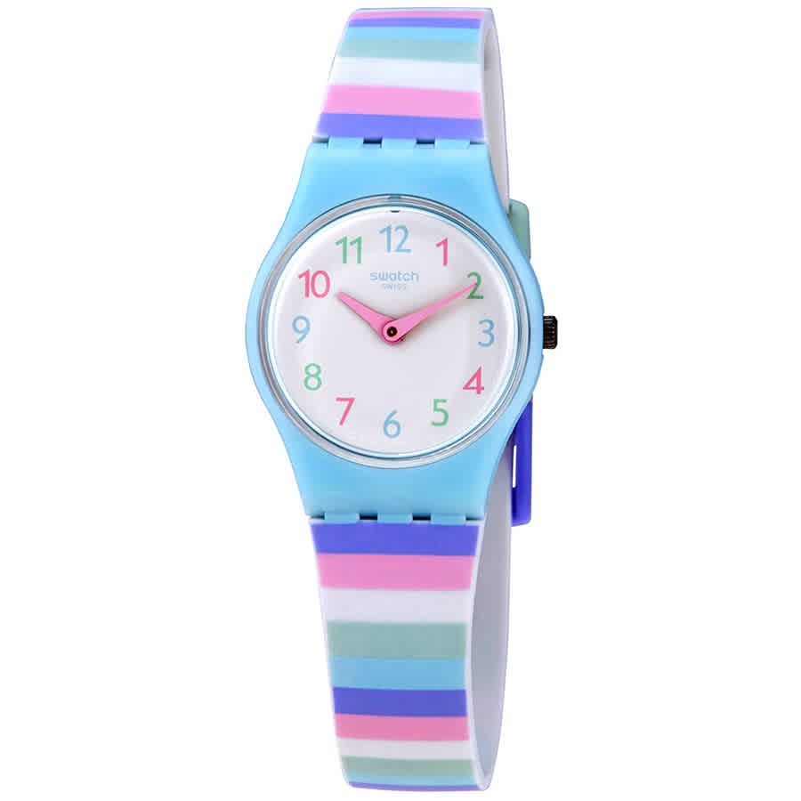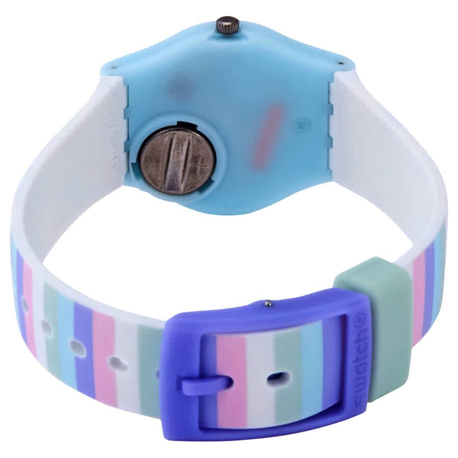 Matte bkue plastic case with a striped pattern of green, blue, purple and pink silicone strap. Fixed bezel. White dial with pink hands and Arabic numeral hour markers. Dial Type: Analog. Quartz movement. Pull / push crown. Transparent case back. Round case shape, case size: 25 mm, case thickness: 7 mm. Buckle clasp. Water resistant at 30 meters / 100 feet. Functions: hour, minute. Casual watch style. Swatch Pastep Quartz White Dial Ladies Watch LL121.