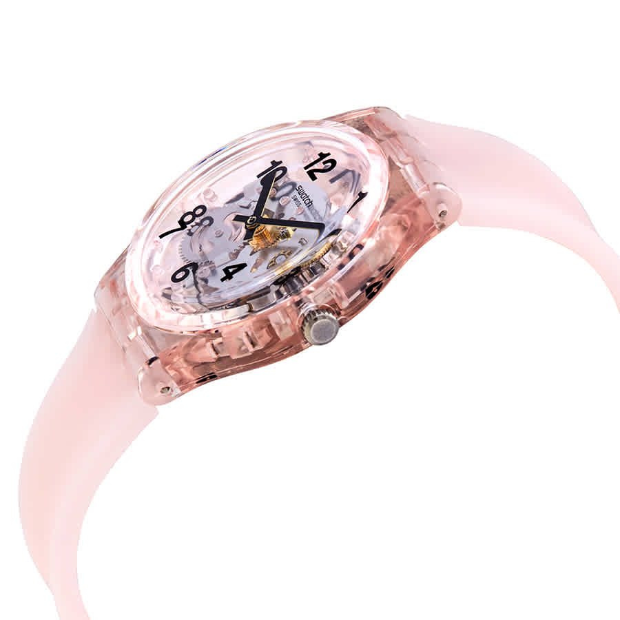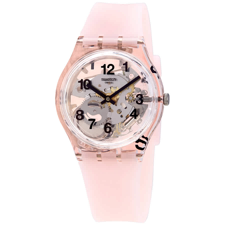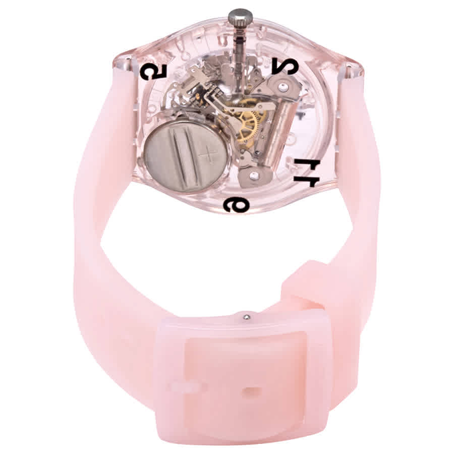 Transparent plastic case with a pink silicone strap. Fixed transparent plastic bezel. Transparent dial with black hands and Arabic numeral hour markers. Dial Type: Analog. Quartz movement. Plexiglass crystal. Pull /...