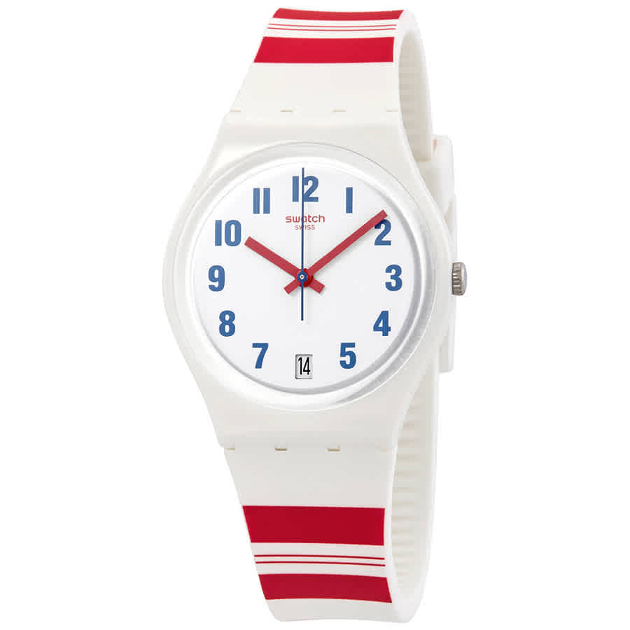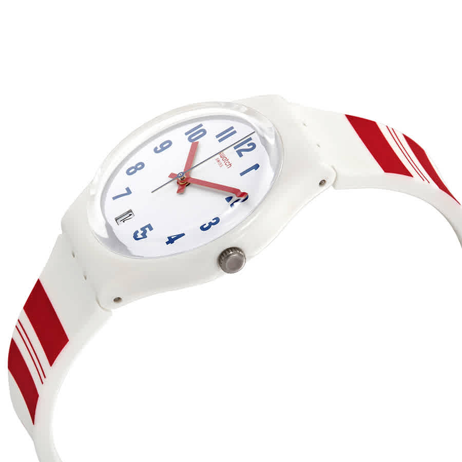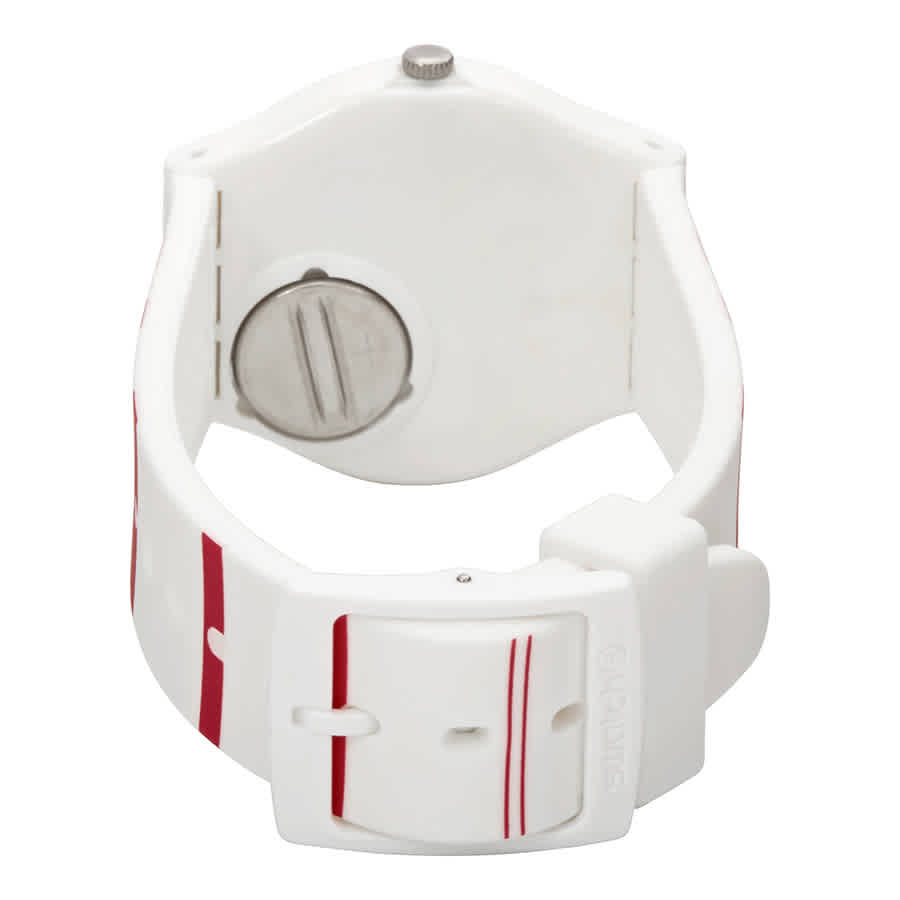 White plastic case with a white and red silicone strap. Fixed bezel. White dial with red hands and Arabic numerals hour markers. Dial Type: Analog. Date display at the 6 o'clock position. Quartz movement. Pull / push crown. Solid case back. Round case shape, case size: 34 mm, case thickness: 8.75 mm. Buckle clasp. Water resistant at 30 meters / 100 feet. Functions: date, hour, minute, second. Casual watch style. Swatch Rosalinie White Dial Ladies Two Tone Watch GW407.