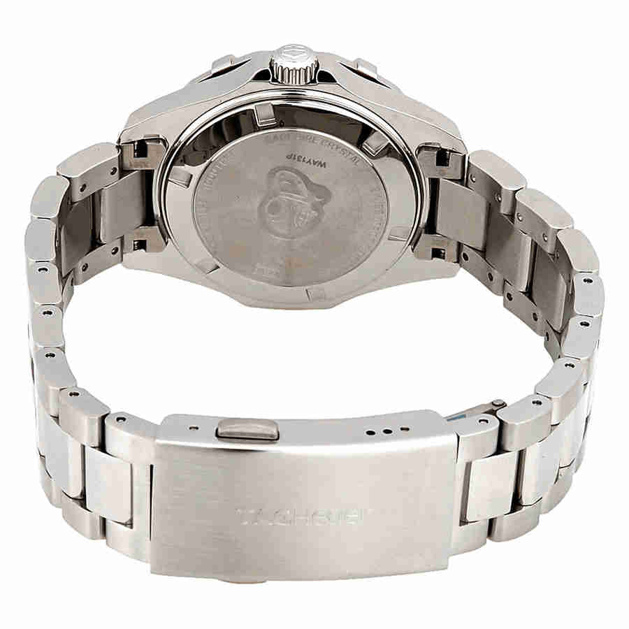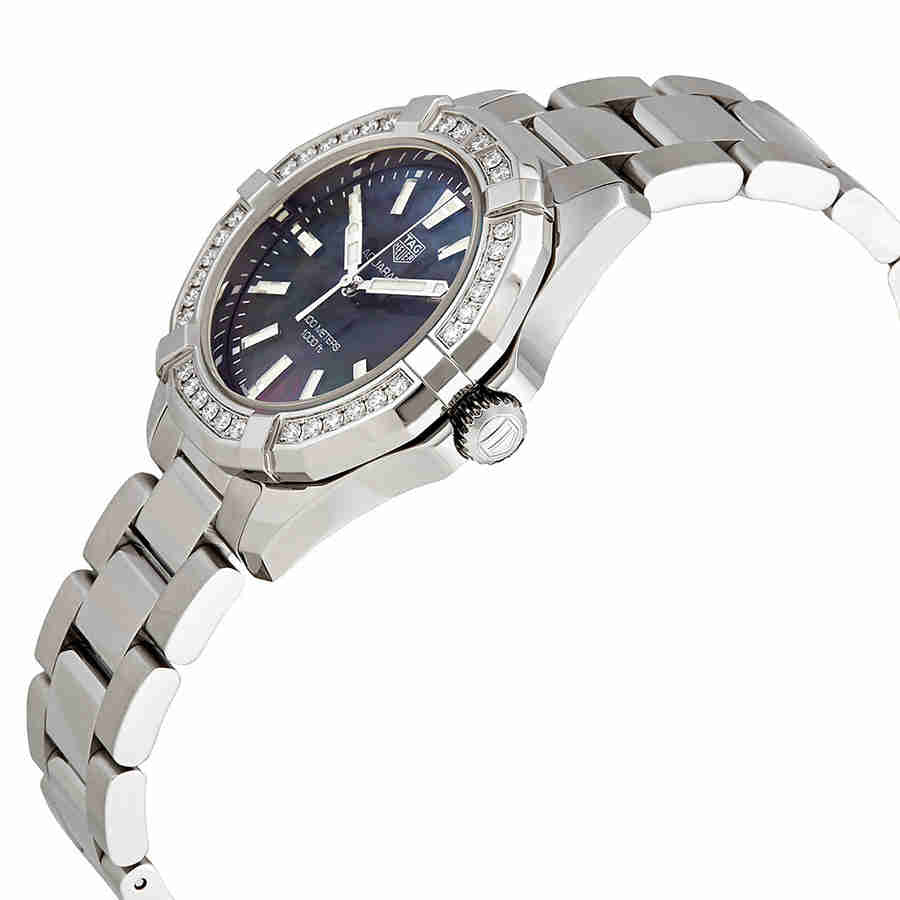 Stainless steel case with a stainless steel bracelet. Uni-directional rotating stainless steel bezel set with 35 diamonds. Black mother of pearl dial with luminous silver-tone hands and index hour markers. Minute...