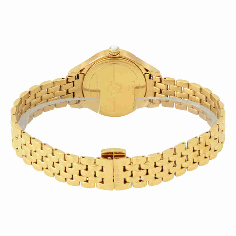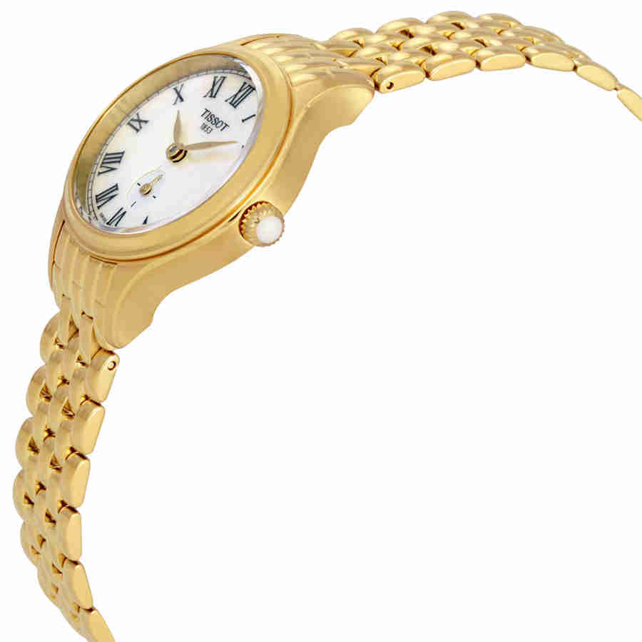 Yellow gold PVD stainless steel case and bracelet. Fixed yellow gold PVD bezel. Mother of pearl dial with yellow gold-tone hands and Roman numeral hour markers. Minute markers around the outer rim. Dial Type: Analog. Small seconds sub-dial. ETA caliber 980.153 quartz movement. Scratch resistant sapphire crystal. Pull / push crown. Solid case back. Case size: 29 mm to 35.9 mm. Case thickness: 7.3 mm. Oval case shape. Band width: 12 mm. Butterfly clasp. Water resistant at 30 meters / 100 feet. Functions: hour, minute, small second. Dress watch style. Watch label: Swiss Made. Tissot Bella Ora Piccola Ladies Watch T1031103311300.