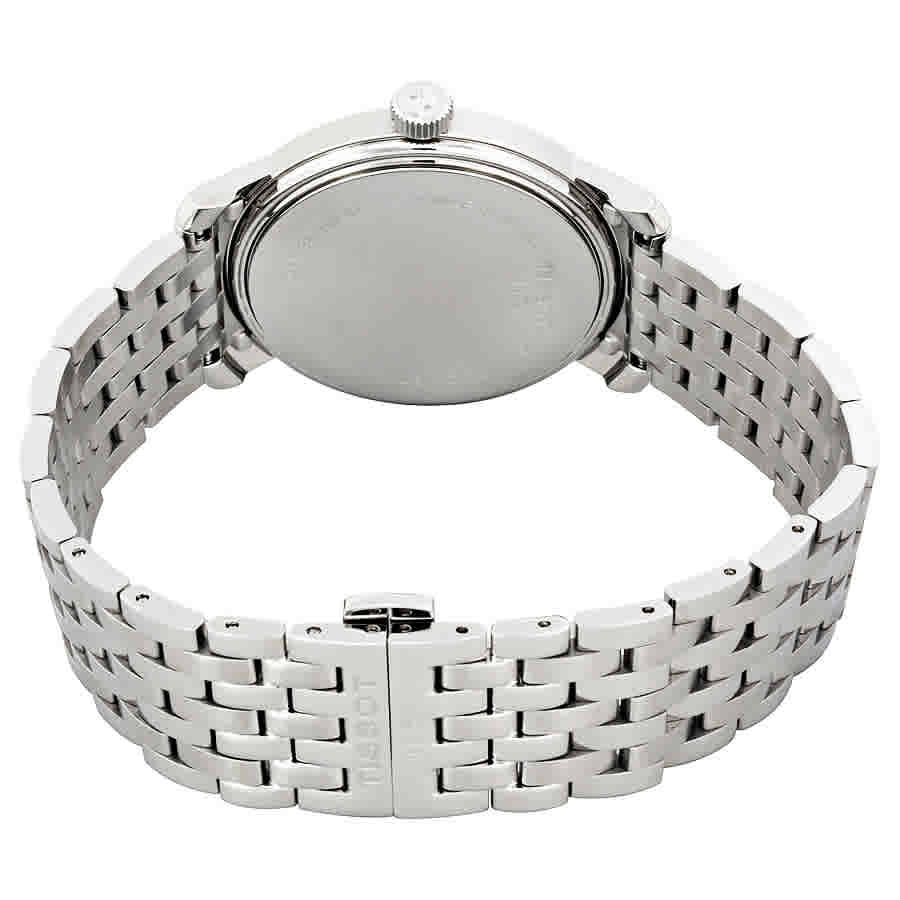 Stainless steel case with a stainless steel bracelet. Fixed stainless steel bezel. Black dial with silver-tone hands and index hour markers. Roman numerals mark the 3, 6, 9 and 12 o'clock positions. Minute markers around an inner ring. Dial Type: Analog. Luminescent hands and markers. Date display at the 3 o'clock position. Quartz movement. Scratch resistant sapphire crystal. Pull / push crown. Solid case back. Case diameter: 40 mm. Case thickness: 8.64 mm. Round case shape. Band width: 20 mm. Deployment clasp with a push button release. Water resistant at 50 meters / 165 feet. Functions: date, hour, minute, second. Casual watch style. Watch label: Swiss Made. Tissot Bridgeport Black Dial Mens Watch T097.410.11.058.00.
