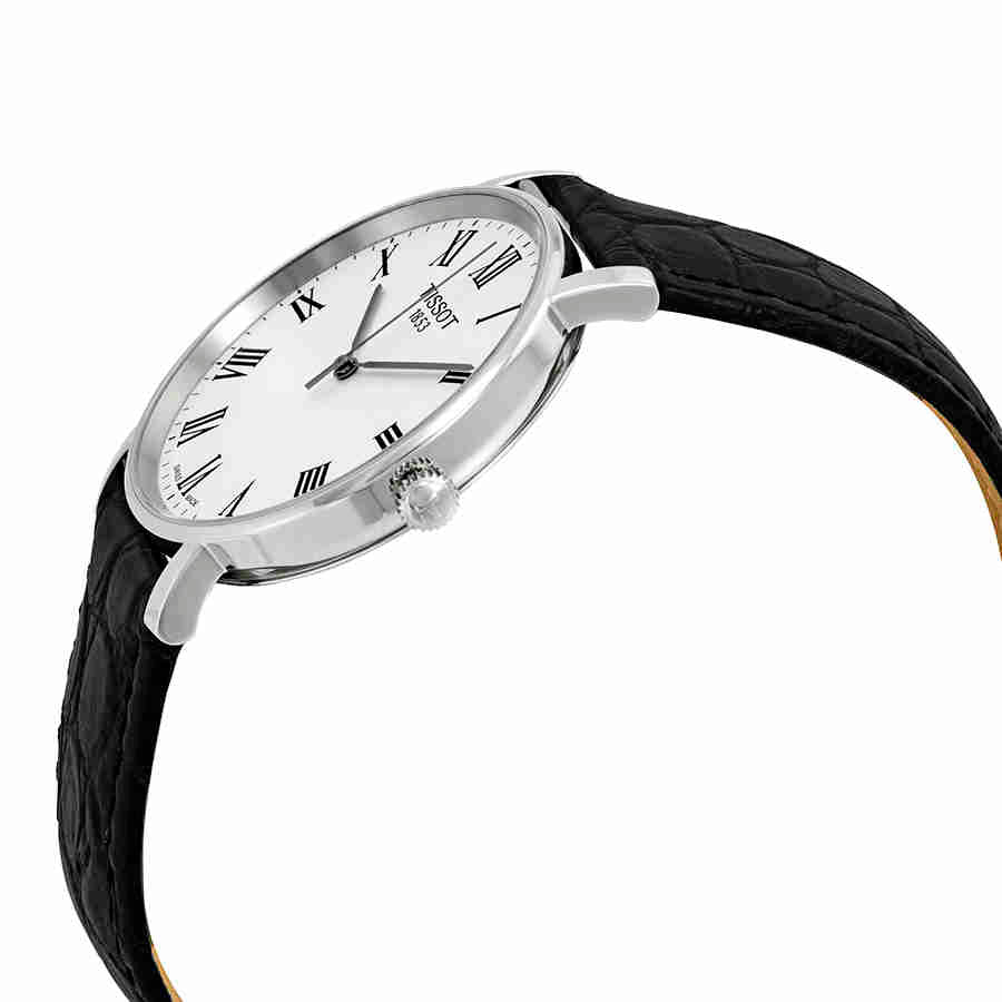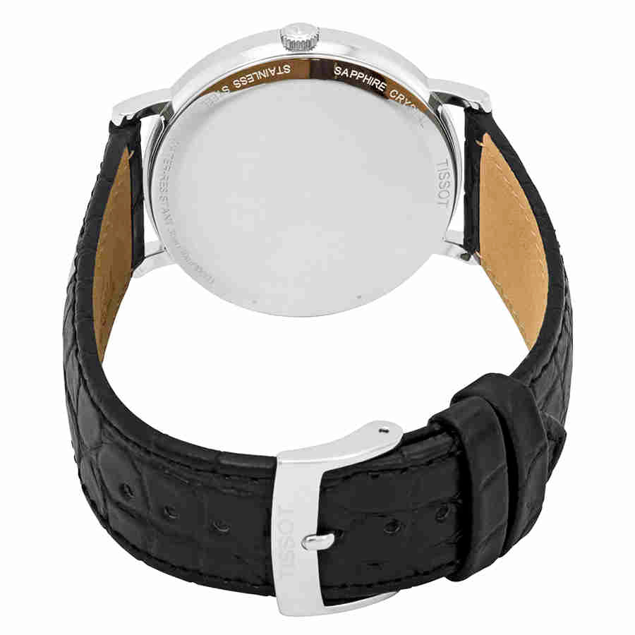 Stainless steel case with a black (calfskin) leather strap. Fixed stainless steel bezel. Silver dial with black hands and Roman numeral hour markers. Minute markers around the outer rim. Dial Type: Analog. ETA 902.101 Swiss quartz movement. Scratch resistant sapphire crystal. Pull / push crown. Solid case back. Round case shape. Case size: 38 mm. Case thickness: 6.5 mm. Band width: 19 mm. Tang clasp. Water resistant at 30 meters / 100 feet. Functions: hour, minute, second. Casual watch style. Watch label: Swiss Made. Tissot Everytime Medium Silver Dial Mens Watch T109.410.16.033.01.